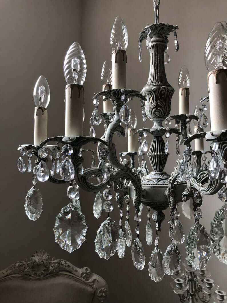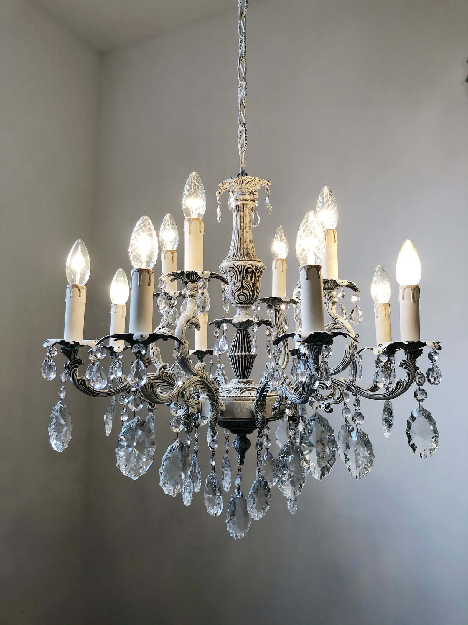 Gorgeous vintage 12 lights chandelier from Italy dating back to the Midcentury in solid brass. it has been renewed in all its parts and decorated grey/ivory color with a patina of antique. Stunning ornate structure!!