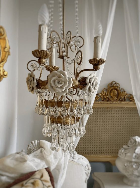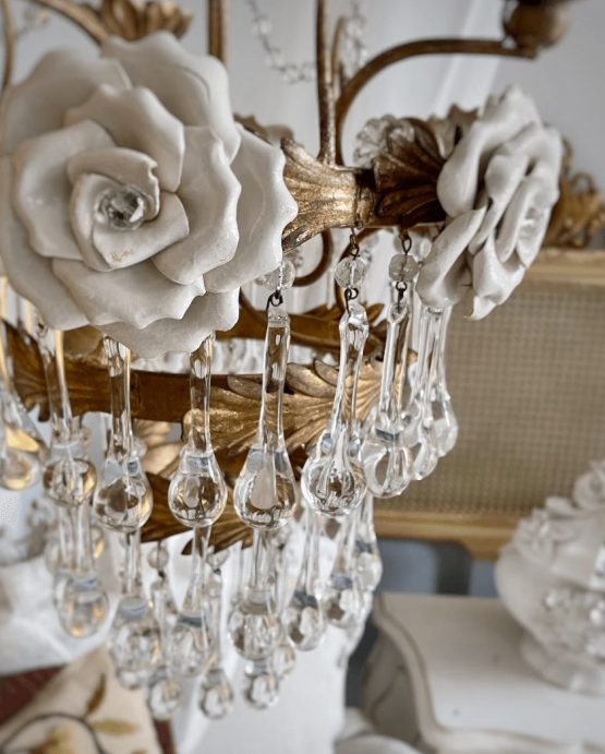 Be the first to review “1920s antique Italian chandelier 3 lights Murano glass drops and white roses”