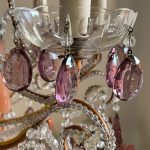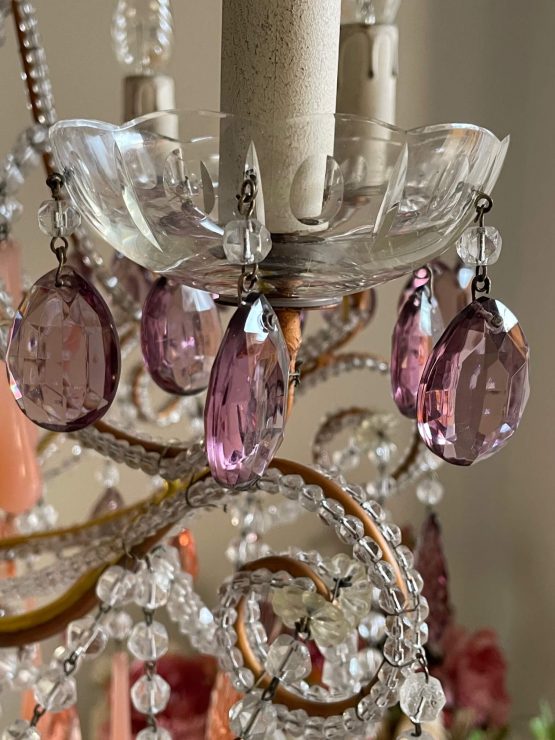 Original peachy pink opaline glass drops and purple glass swags from Murano (Venice) and luminous crystals, rare purple crystal drops.