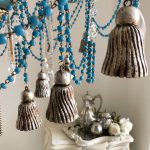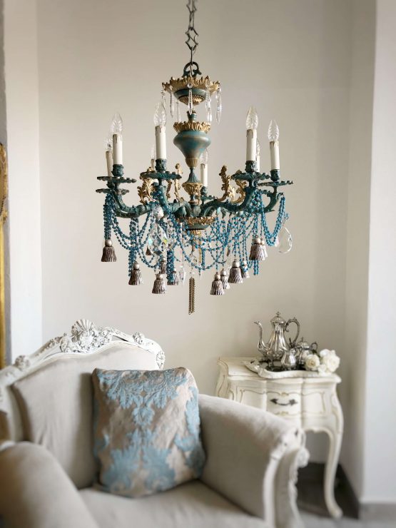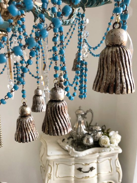 I have repurposed it and hand painted it using this splendid tone of turquoise with some touches of gold. It has been enriched with AAA quality materials from 5 different vintage chandeliers: very ornate bronze structure, glass swags from Murano, long crystals, crystal tear drops, Swarovski prisms, wood tassels and bronze chains.