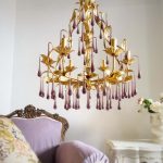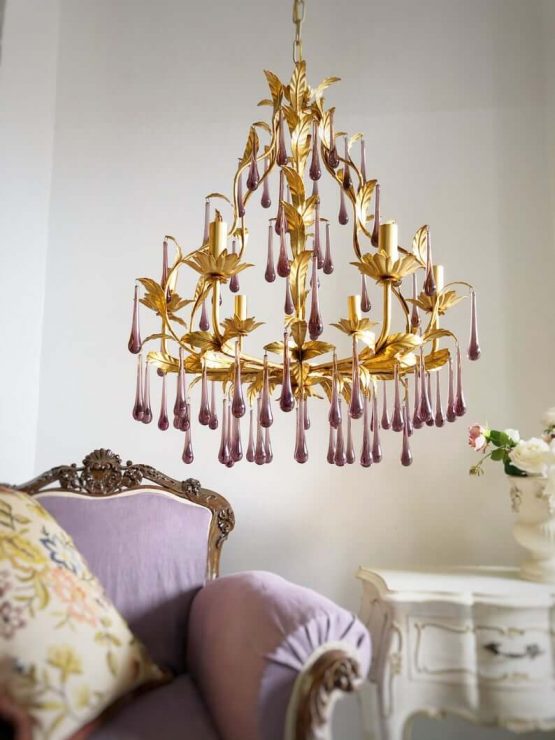 Be the first to review “Gold leaf chandelier, amethyst Murano glass drops”
