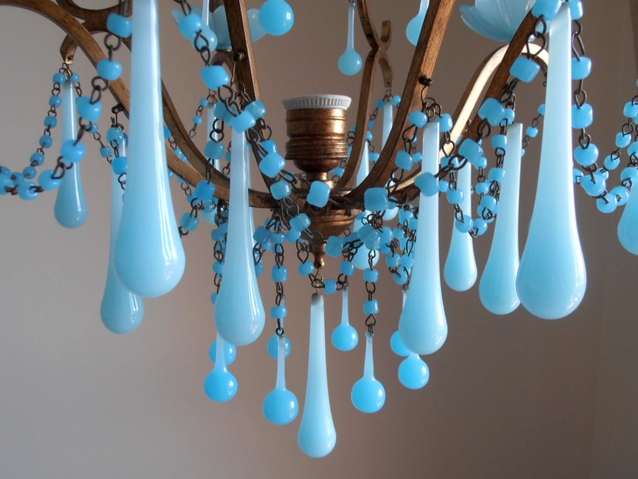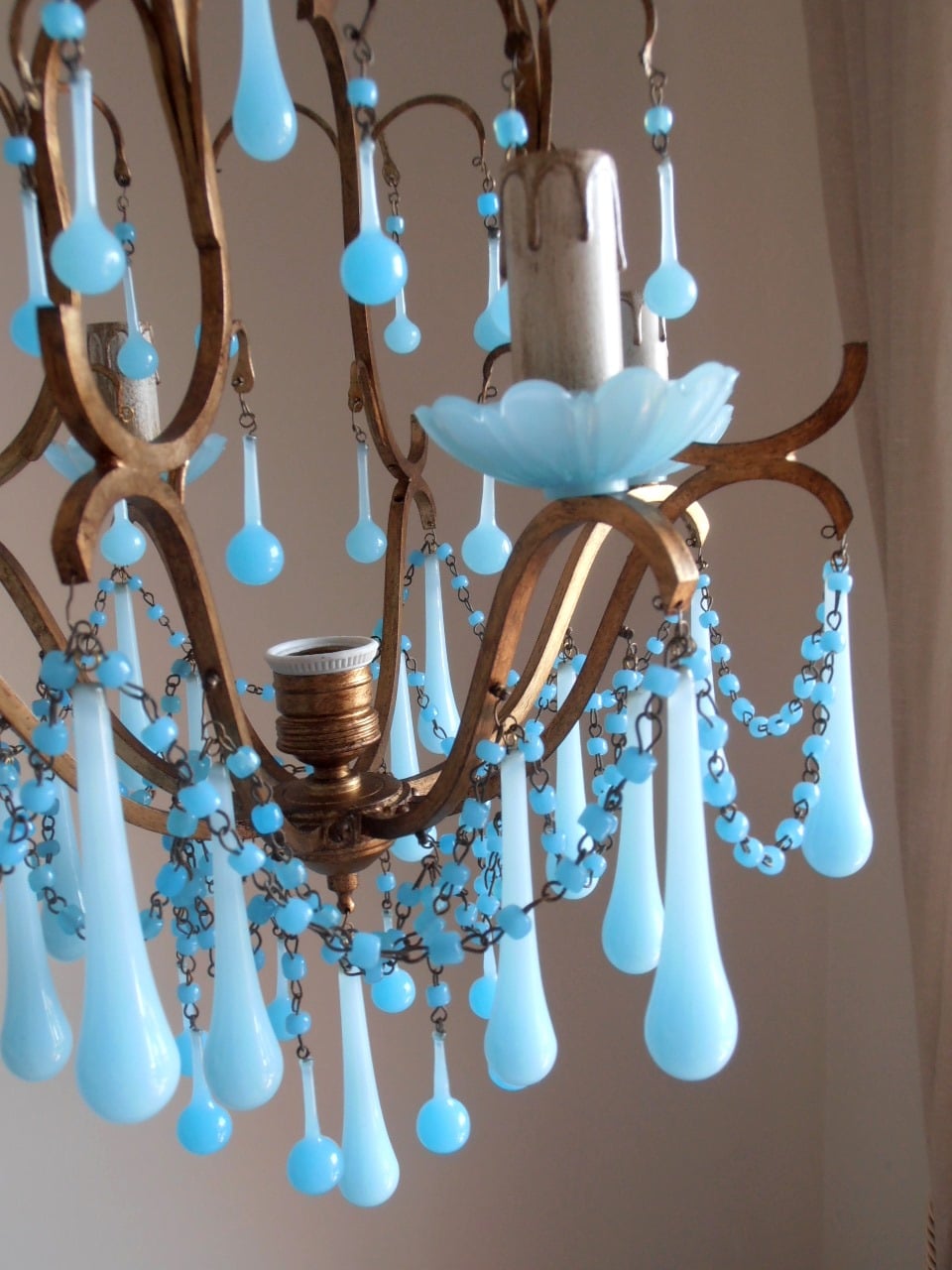 What makes it really unique are the aqua blue opaline bobeches and drops and the Macaroni beads swags which convey to this piece a luminous and light look.