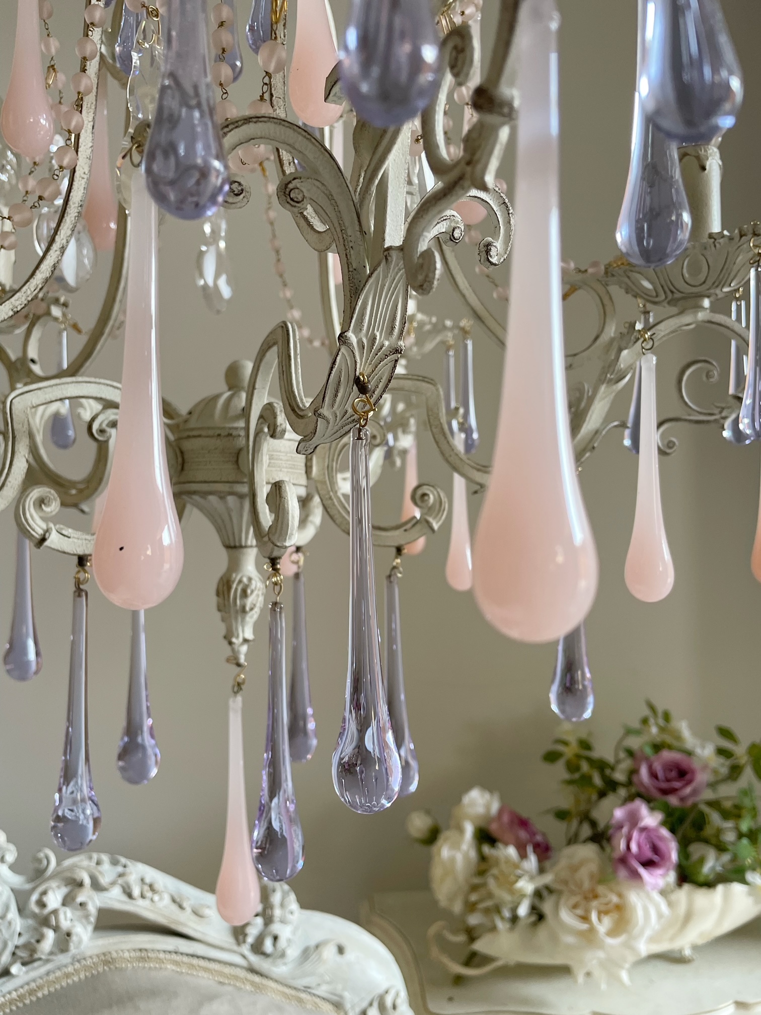 Original vintage pink opaline and lilac glass drops from Murano (Venice, Italy) and pink opaline glass swags are a perfect combination with the lilac hand made peonies in porcelain.