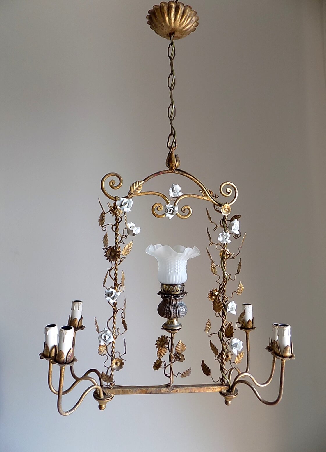 This authentic Italian antique chandelier is a ready-to-use treasury item from the early Century! It has 6 lights at the sides and one at the top. it’s very original and elegant with its cage structure and the tole leaves and porcelain flowers.