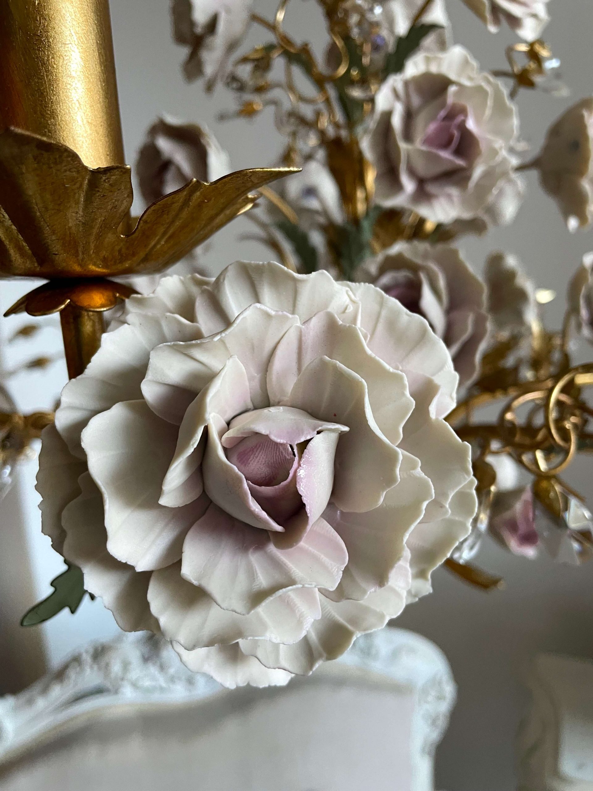 RESERVED for O. Capodimonte Porcelain peonies chandeliers with crystals 6 lights