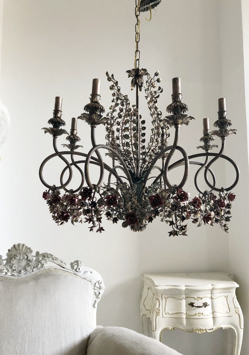This is a majestic 8 arms chandelier in wrought iron with hand-forged curvy arms and hand-decorated flowers.