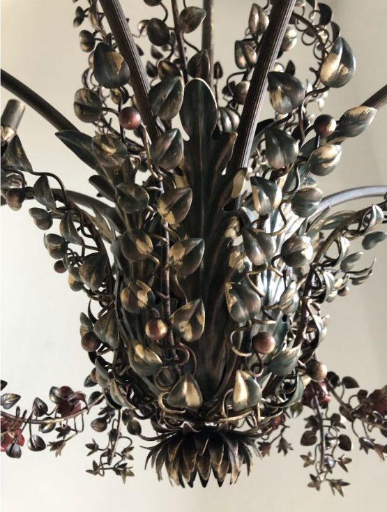 This is a majestic 8 arms chandelier in wrought iron with hand-forged curvy arms and hand-decorated flowers.