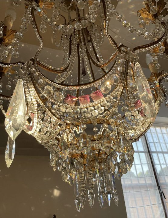 New wiring and polish of the antique gold wrought iron structure all covered by crystal beads and florettes.