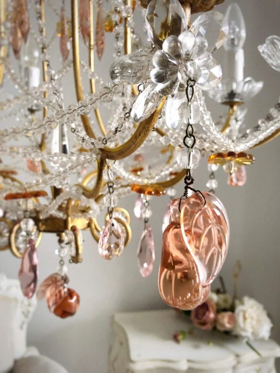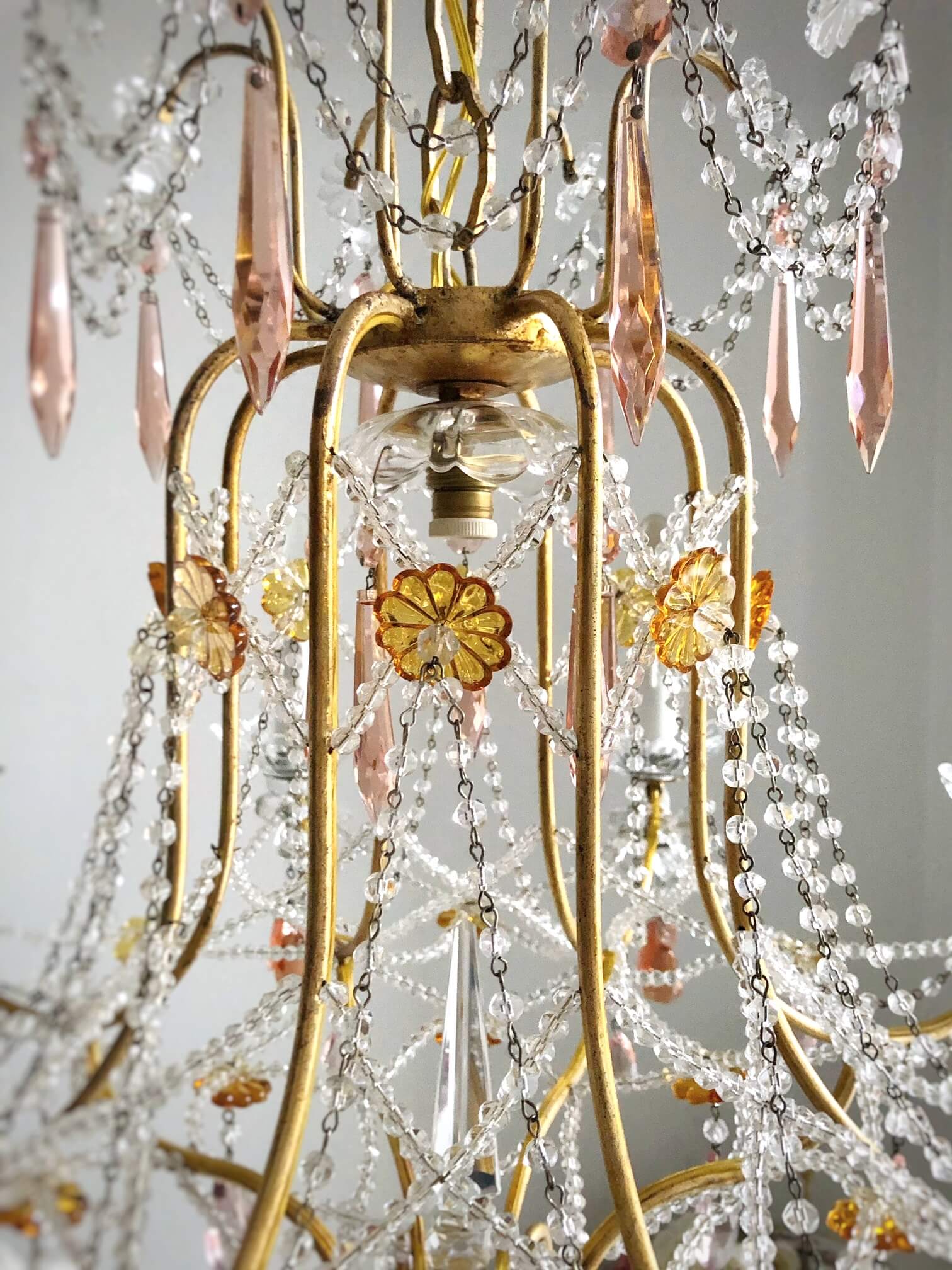 Venetian vintage 9 lights chandelier, beaded Italian pink crystals and Murano glass fruits pendants