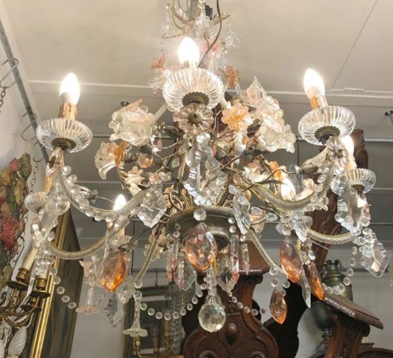 It is very original in shape with great details, as it has Murano glass flowers and drops in different nuances of pink from clear to peachy and many other decorative details such as crystal swags and beaded arms (this is a huge handmade work).