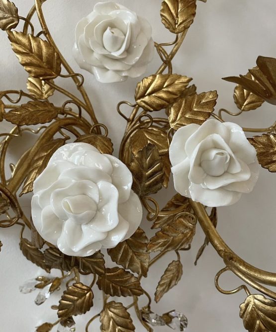Be the first to review “gold leaf wall lamps, wrought iron sconces with white porcelain roses”