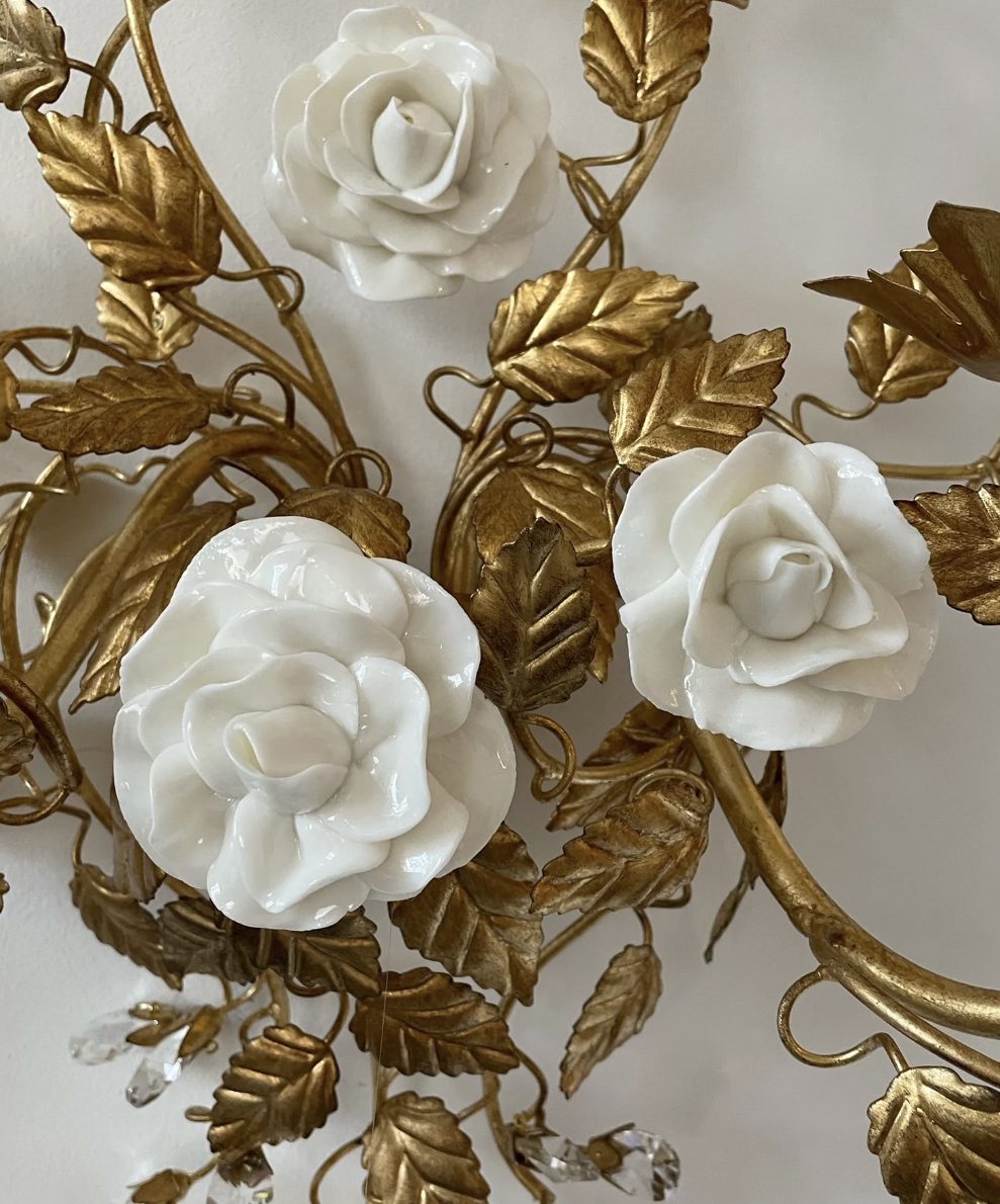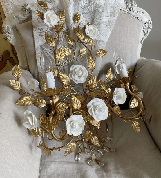 SET of 2 Statement made in Italy gold leaf wall lamps, wrought iron sconces with white porcelain roses