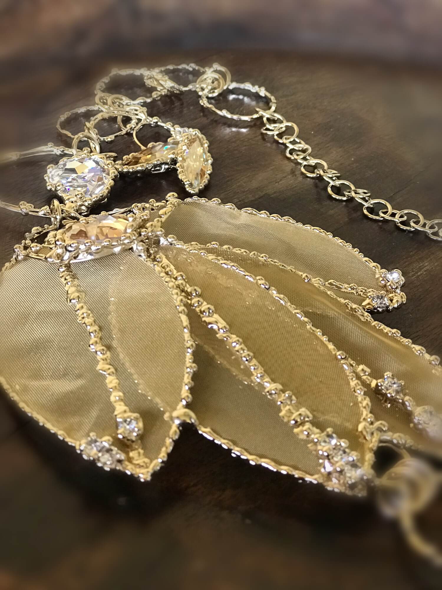 This precious tieback has been fully handmade with AAA quality materials. The leaves have been made with metal fabric which has been hand shaped and encrusted with Swarovski and rhinestones luminous elements, all hand soldered piece by piece and then finished with 24kt light gold.